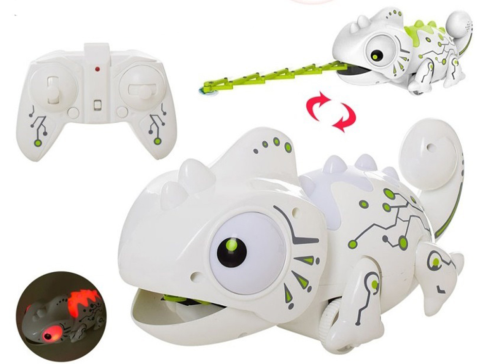 Хвост и глаза имеют подсветку из 12 цветов и сможете выбрать который нравиться. Динозаврик хамелеон ловит при помощи стреляющего языка.
