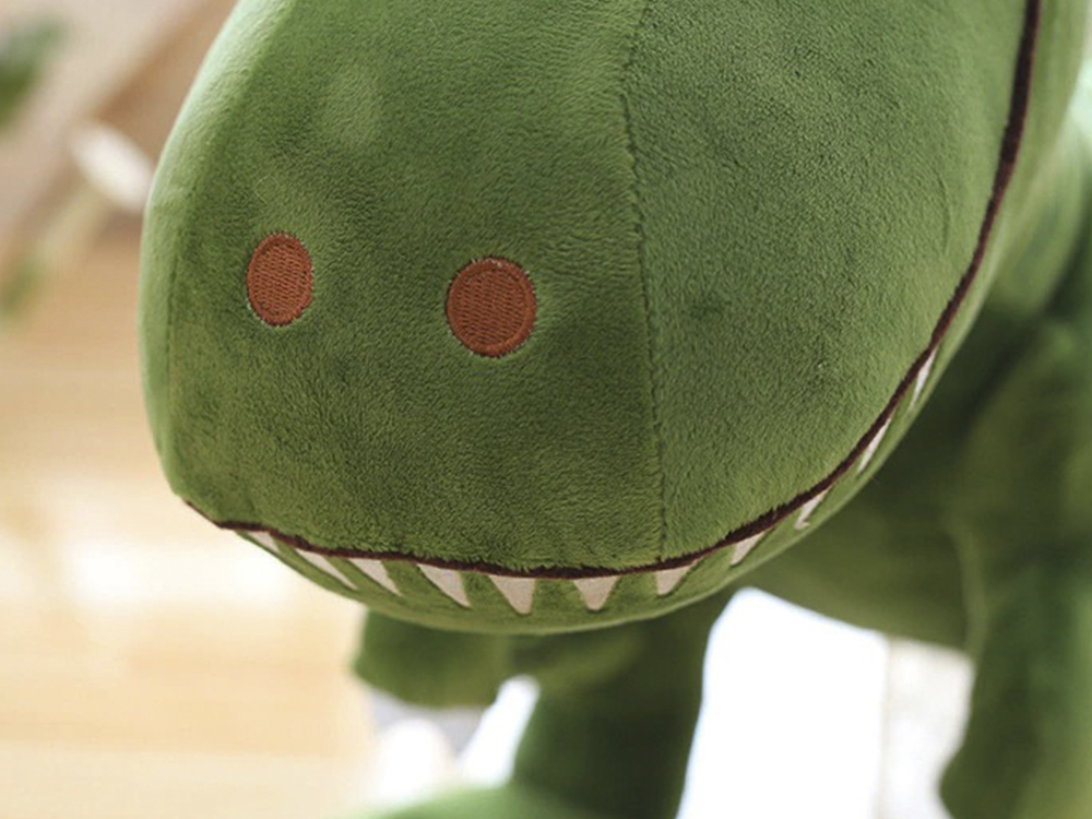 Динозаврик имеет большие, круглые глаза, улыбку до ушей и острые зубы, когти, хвост имеет темно зеленые полоски. Все вышито нитками.