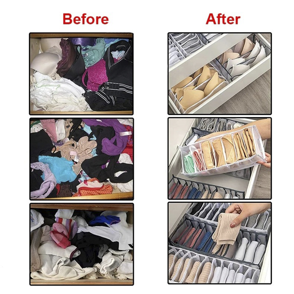 В комплект входит органайзер для лифчиков на 6 секций, органайзер для носков, трусов и других мелочей на 12 секций и органайзер на 7 секций для колгот и т.д. одежды или белья.