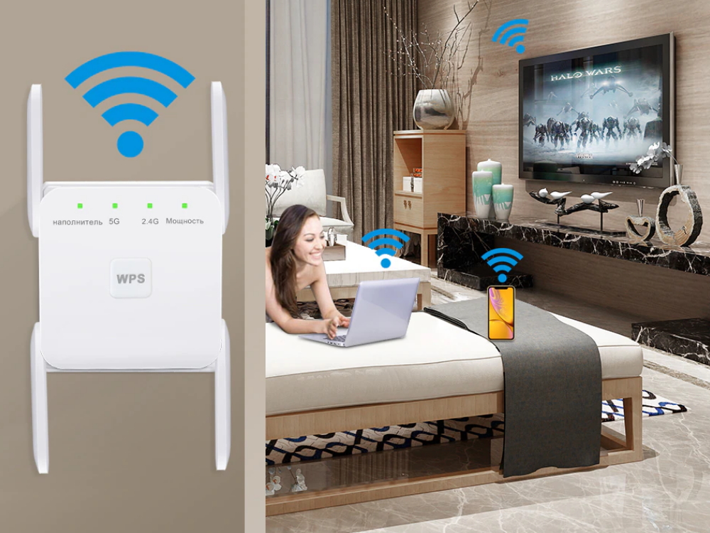 Беспроводной Wi-Fi ретранслятор усилитель Wi-Fi 2.4/5 ГГц 300/1200 Мбит/с - отличный ретранслятор, который пригодится в каждом современном доме. У него стильный «хай-тек» дизайн, он прост в установке и управлении, поддерживает передовые технологии.
