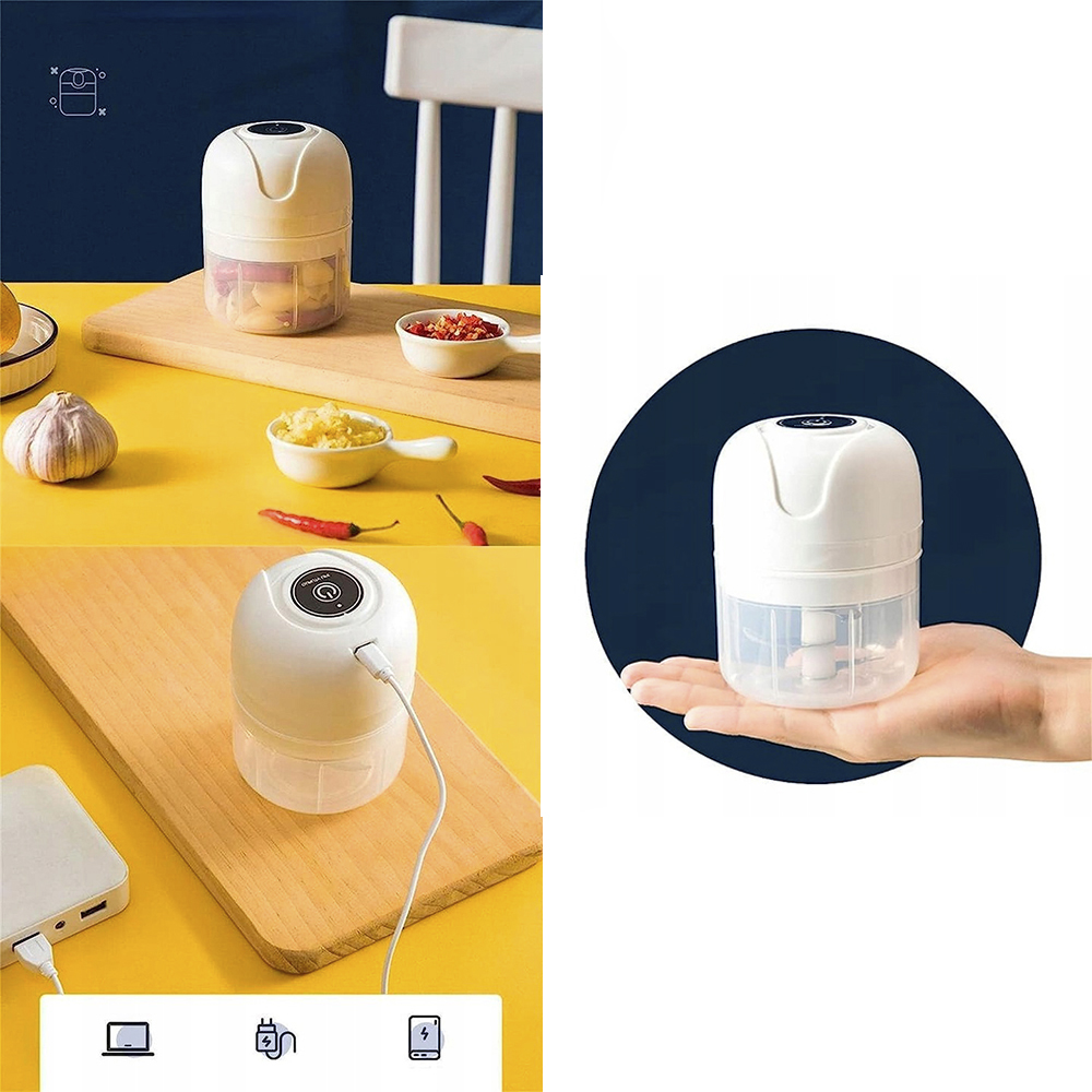 Кухонный мини блендер аккумуляторный - Компактный кухонный измельчитель оснащен USB-портом, сопровождается кабелем для подключения к различным устройствам. Для подсоединения к электросети предусмотрена возможность использования специального адаптера, который приобретается отдельно. Устройство включает в себя эффективный мотор, обеспечивающий быстрое вращение ножей из прочной нержавеющей стали, что гарантирует легкость и скорость нарезки разнообразных продуктов. Ножи имеют трехуровневую конструкцию для ускоренной обработки ингредиентов. Включение беспроводного измельчителя достигается нажатием кнопки на крышке, удержание которой в течение 20 секунд приведет к измельчению содержимого. Помимо чеснока, устройство подходит для лука, овощей, фруктов, орехов, а также приготовления детского пюре и предварительной подготовки ингредиентов. Объем чаши 250 мл позволяет готовить множество блюд, упрощая приготовление как ежедневных, так и праздничных обедов. Чистка производится просто под проточной водой. Благодаря малым размерам, измельчитель легко хранить и использовать. Рекомендуется промывать и высушивать перед первым использованием, а также проверять правильность сборки перед работой.