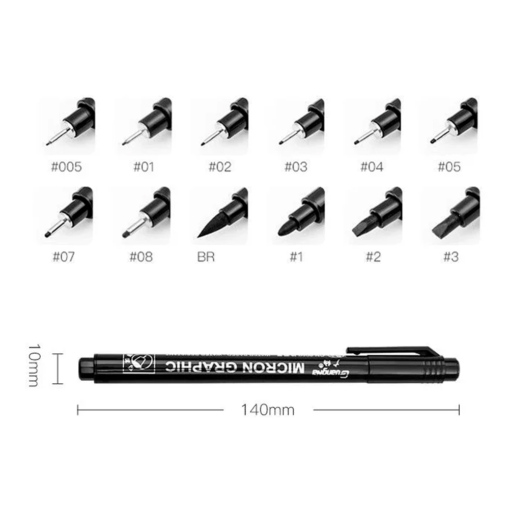 Этот набор включает в себя разнообразие размеров для любых задач: от сверхтонких 0,05 мм, 0,1 мм, 0,2 мм до тонких 0,3 мм, 0,4 мм, средних 0,5 мм, 0,7 мм, 0,8 мм и четырех кистей 1 мм, 2 мм, 3 мм и BR, предоставляя возможность создавать линии разной ширины. Наконечники для каллиграфии расширяют спектр творческого применения, от эскизов до иллюстраций, мандал, граффити, комиксов, скетча и более.