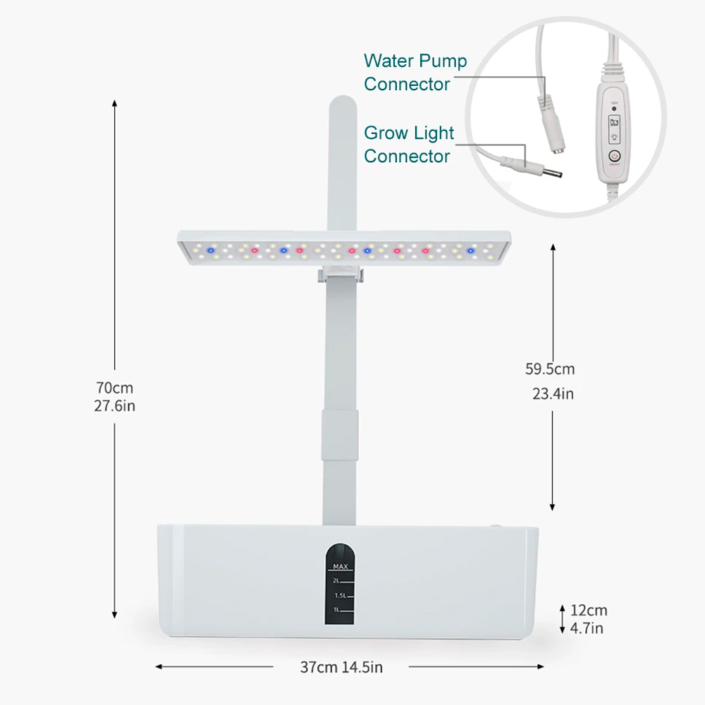 В этот комплект для домашнего сада входит резервуар для воды емкостью 2 л с индикатором уровня воды, который покажет, сколько воды осталось. Он также сигнализирует о слишком низком уровне воды, напоминая о необходимости долить воду. Встроенная система циркуляции водяного насоса доставляет кислород к корням растений, предотвращая гниение.