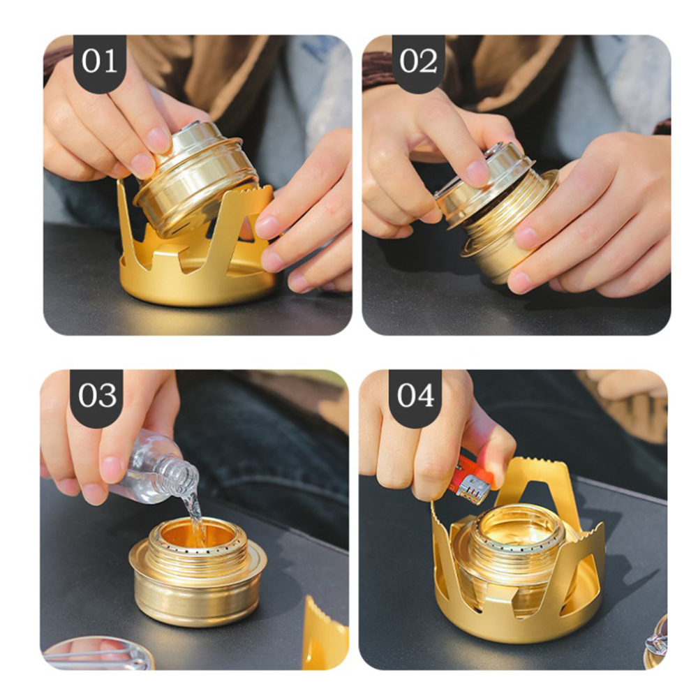 Горелка состоит из основной ёмкости с крышкой, удобной подставки с зубцами для устойчивости посуды и крышки с ручкой-зажимом, которая предотвращает испарение топлива. Специальная конструкция с множеством отверстий обеспечивает равномерное распределение пламени, что делает приготовление пищи эффективным и безопасным.