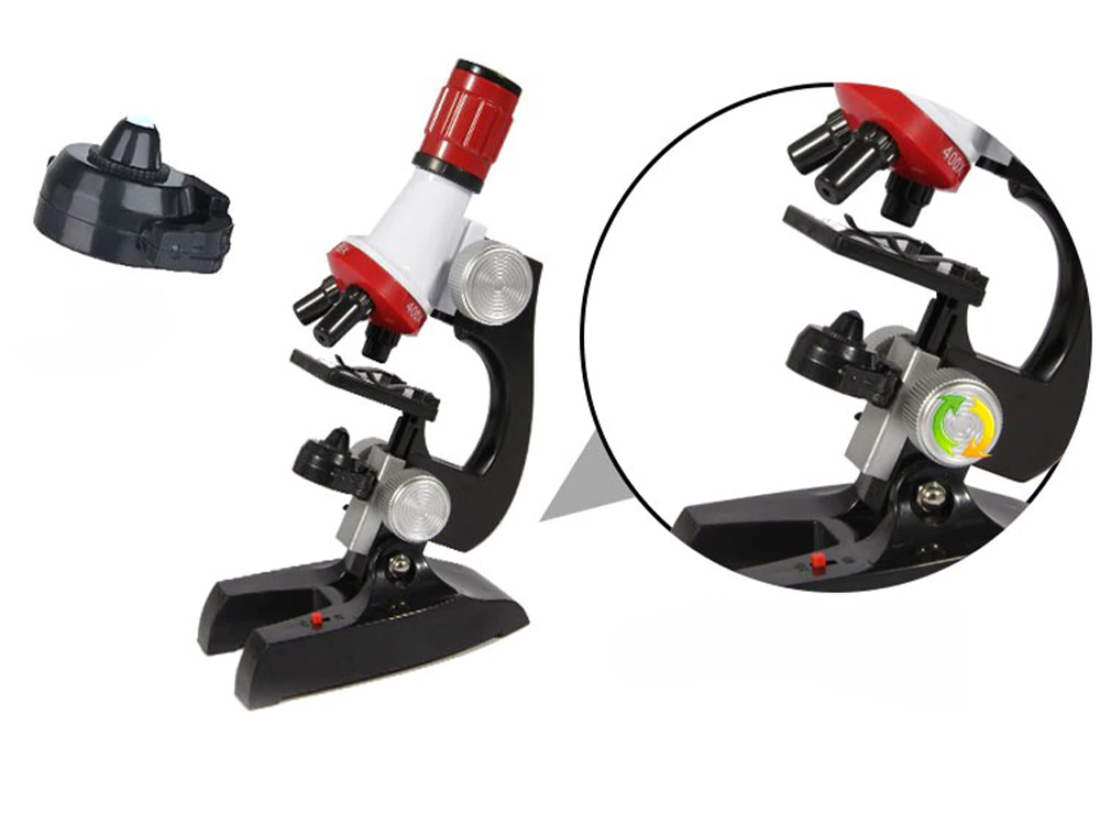 Мікроскоп має підсвічування і збільшення в 100 Х, 400 Х, 1200 Х.