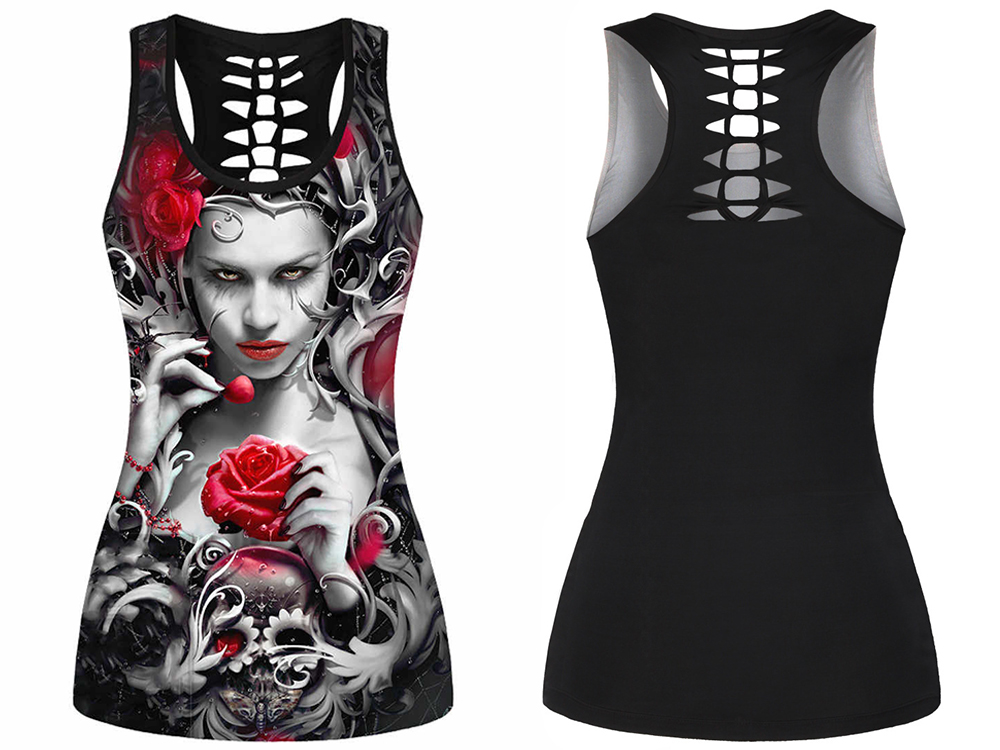 Футболка з принтом Особа і троянди - це креативна одяг для дівчат в стилі Санта Муерте, тобто в готичному стилі з переважанням темних, чорних тонів. Футболка виконана з поліестеру з спандексом і прикрашена оригінальним малюнком у вигляді портрета дівчини з трояндами.