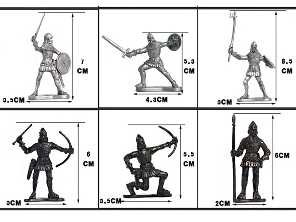- Розмір солдатиків різний, в залежності від пози: 7 см х 3,5 см, 3 см х 8,5 см, 4,3 см х 5,3 і т.д